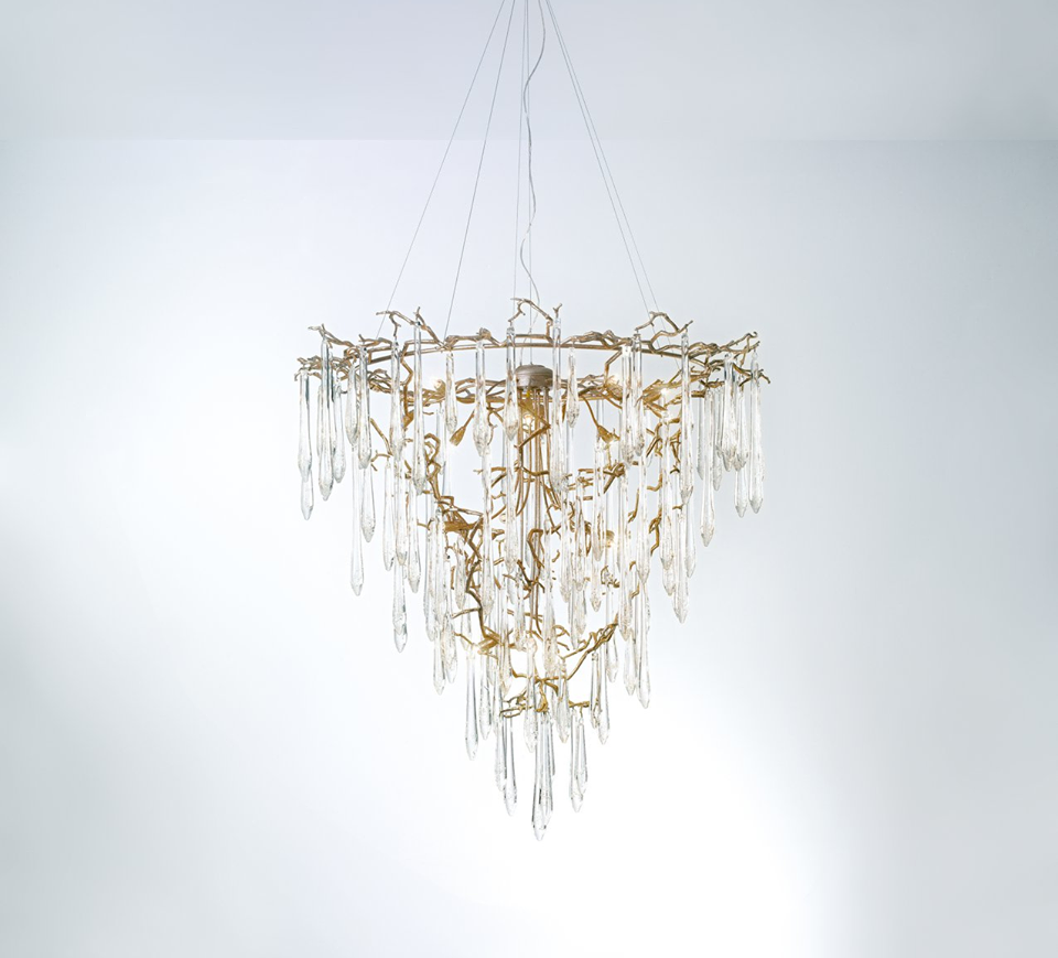 Những giọt pha lê treo rủ xuống – được chế tác từ cát thạch anh nguyên chất, qua nhiều công đoạn nung, đổ, cắt và mài hoàn toàn bằng tay. Mỗi khối pha lê không hề giống nhau, nhưng chính sự khác biệt ấy tạo nên một tổng thể đồng điệu, tự nhiên như những giọt sương sáng long lanh trên cành vàng buổi sớm.