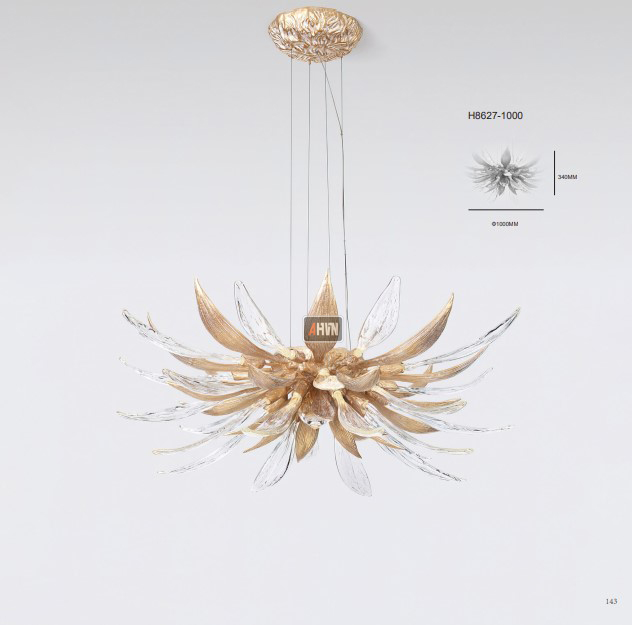 Những cánh pha lê được thổi và kéo thủ công, trong suốt xen kẽ ánh vàng, phản chiếu ánh sáng tựa như những giọt sương đang khẽ chạm lên cánh hoa. Khi ánh sáng được bật lên, toàn bộ khối đèn như một đóa hoa ánh sáng lan tỏa trong không gian, rực rỡ mà vẫn tinh khôi, sang trọng nhưng đầy chất thơ.