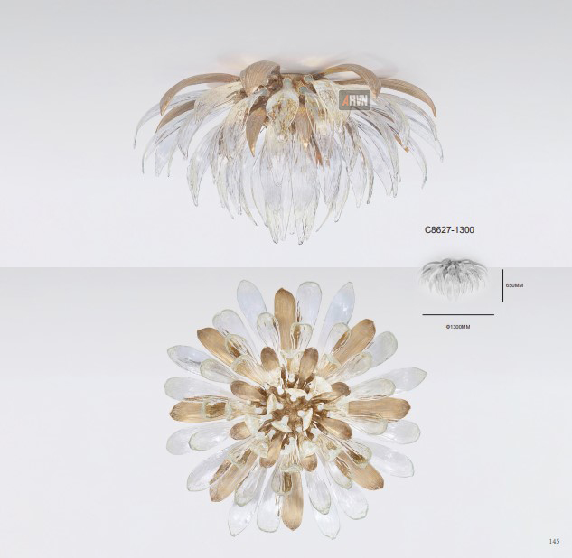 Phần pha lê được thổi và kéo thủ công từng chiếc một, trong suốt như giọt sương, với hiệu ứng phản sáng tinh tế. Khi ánh sáng lan tỏa, những cánh pha lê và đồng giao hòa, tạo nên hiệu ứng lung linh, như một bông hoa ánh sáng đang nở rộ trên trần nhà.