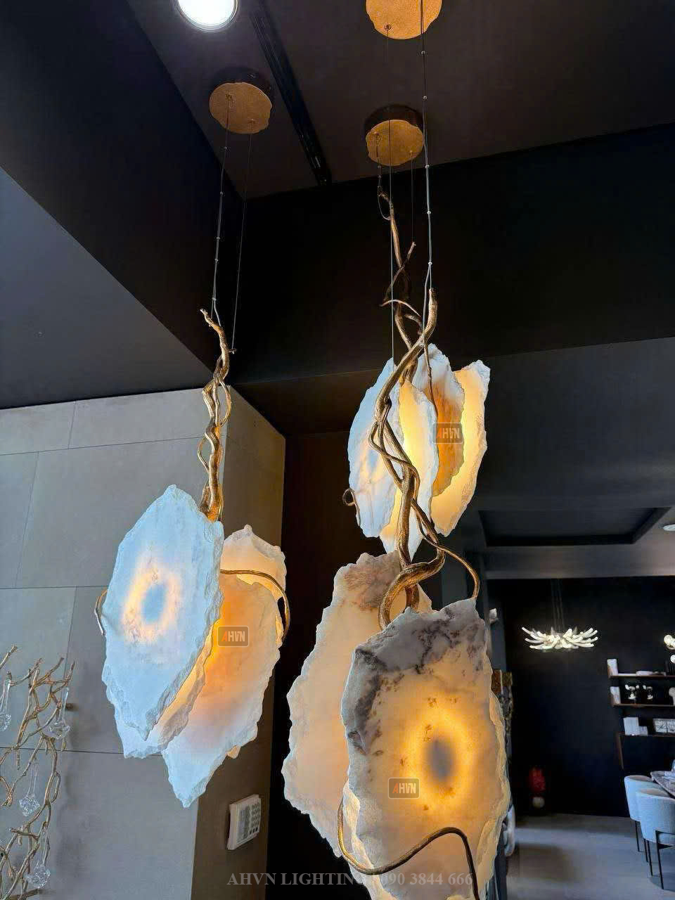 Chiếc đèn thả AHVN này được chế tác thủ công từ đồng thau nguyên chất và đá tự nhiên nhập khẩu Nam Phi, là sự hòa quyện tinh tế giữa vật liệu thật và nghệ thuật ánh sáng – nơi thiên nhiên được đưa vào không gian sống với hình hài sang trọng và đầy cảm xúc.