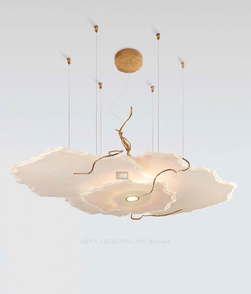 Chiếc đèn thả trần AHVN này được chế tác hoàn toàn thủ công từ đồng thau nguyên chất và đá tự nhiên nhập khẩu từ Nam Phi – một tác phẩm nghệ thuật ánh sáng mang dáng dấp của mây trời, nhẹ mà sâu, tự nhiên mà sang trọng.
