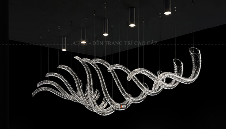 Phần mâm đèn làm bằng inox, giữ kết cấu chắc chắn, tinh gọn và hiện đại, giúp tổng thể trở nên nhẹ mắt nhưng vẫn bền vững theo thời gian. Hệ treo độc lập nhiều điểm tạo cảm giác đèn đang “lơ lửng” – giống như một chuyển động ánh sáng đang được đông cứng lại giữa không trung.