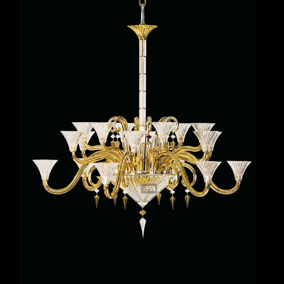 Chiếc đèn chùm trong hình là một thiết kế mang quy mô và tỷ lệ ấn tượng, được chế tác hoàn toàn thủ công từ pha lê K9. Mỗi tay đèn, mỗi chụp pha lê dạng loa, mỗi chi tiết uốn cong đều được tạo hình bằng tay, giữ lại độ mềm, độ trong và khả năng bắt sáng tự nhiên mà chỉ kỹ nghệ thủ công mới có thể tạo ra.
