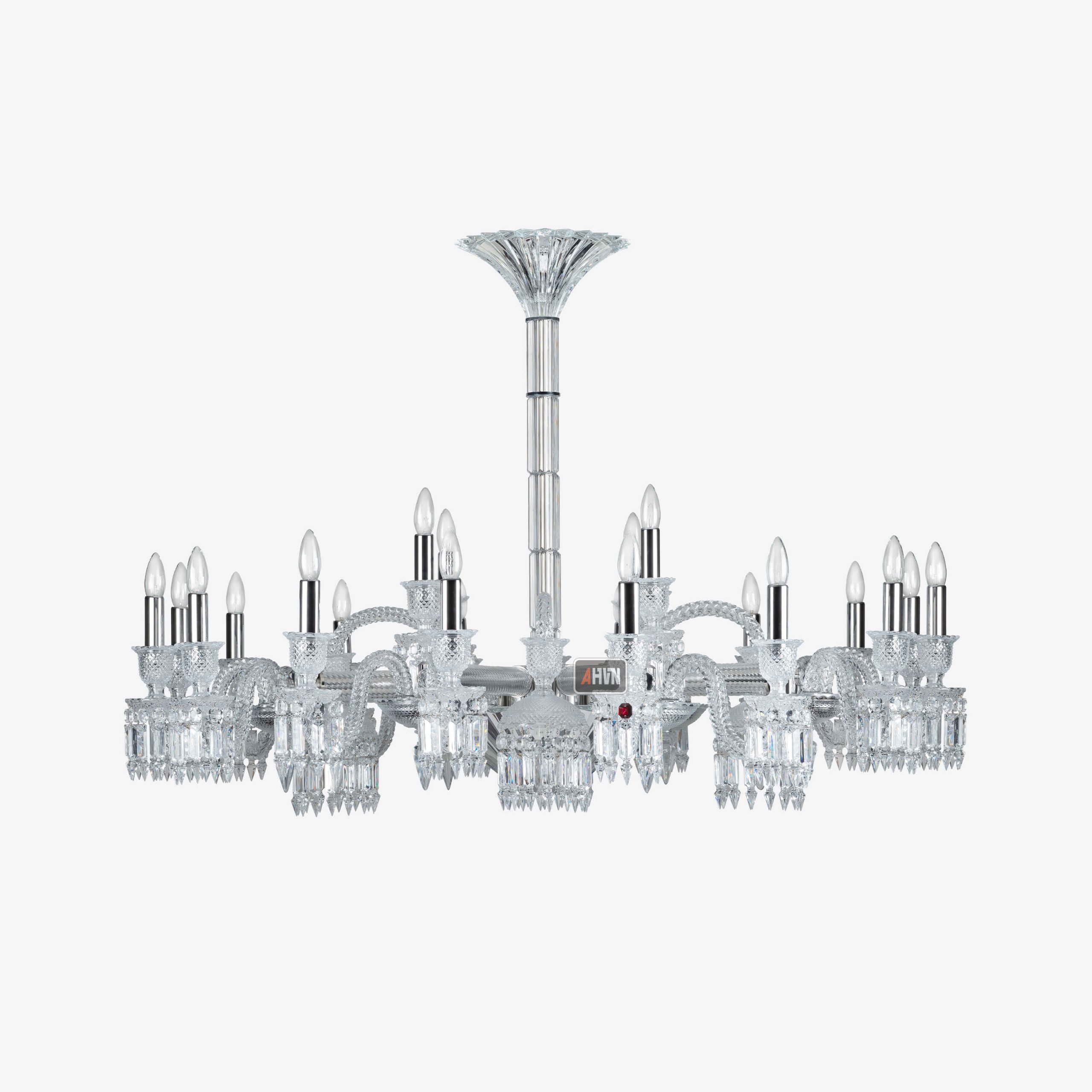 Các chi tiết tay đèn, hạt pha lê và thân trục đều được mài – cắt – hoàn thiện bằng tay, tạo nên một tổng thể sắc sảo và đồng nhất. Kiểu dáng đèn mang hình thức đối xứng, trường dáng thoáng và trải rộng, lý tưởng cho những không gian lớn cần một điểm nhấn trung tâm có chiều sâu ánh sáng.