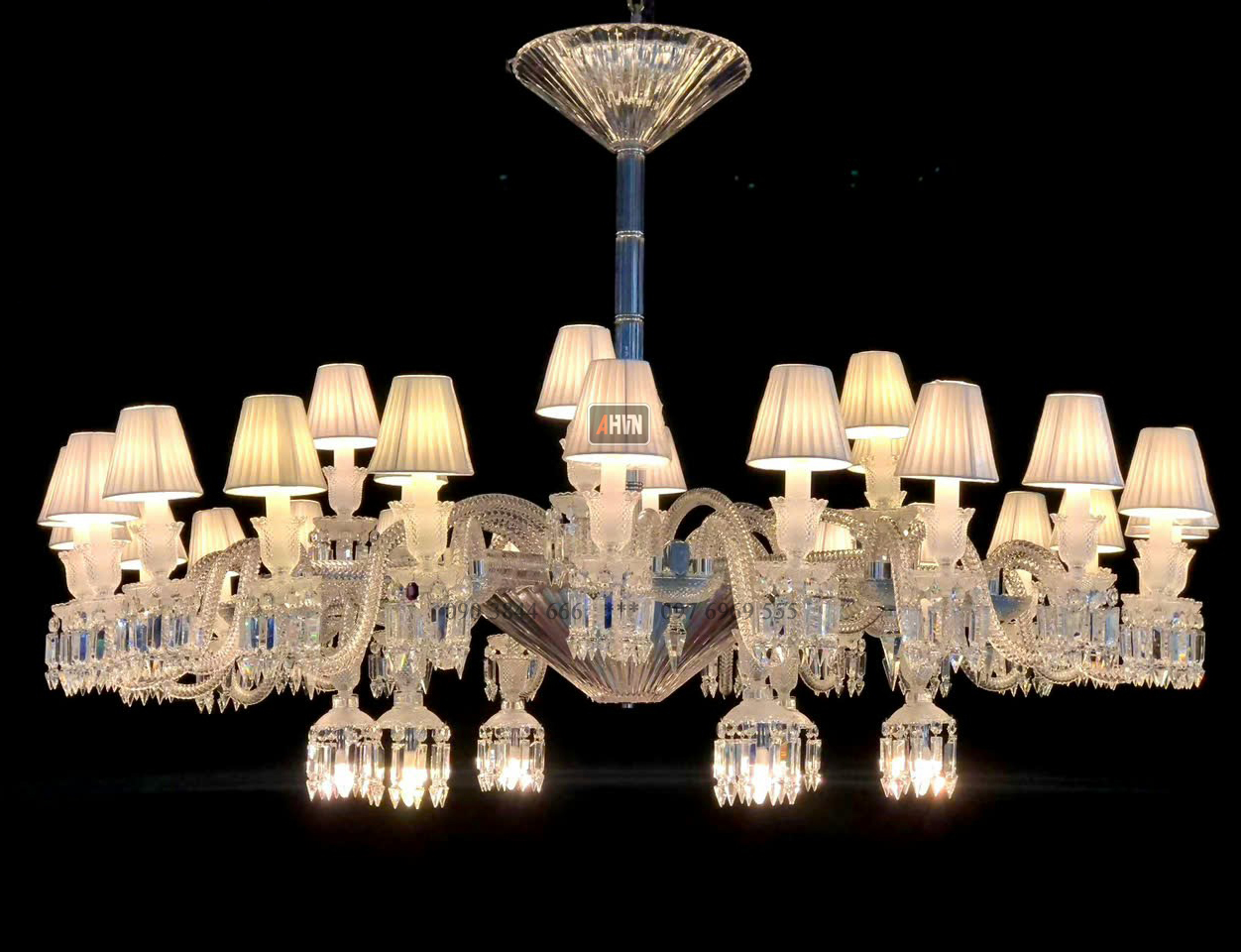 Các chi tiết tay đèn, hạt pha lê và thân trục đều được mài – cắt – hoàn thiện bằng tay, tạo nên một tổng thể sắc sảo và đồng nhất. Kiểu dáng đèn mang hình thức đối xứng, trường dáng thoáng và trải rộng, lý tưởng cho những không gian lớn cần một điểm nhấn trung tâm có chiều sâu ánh sáng.