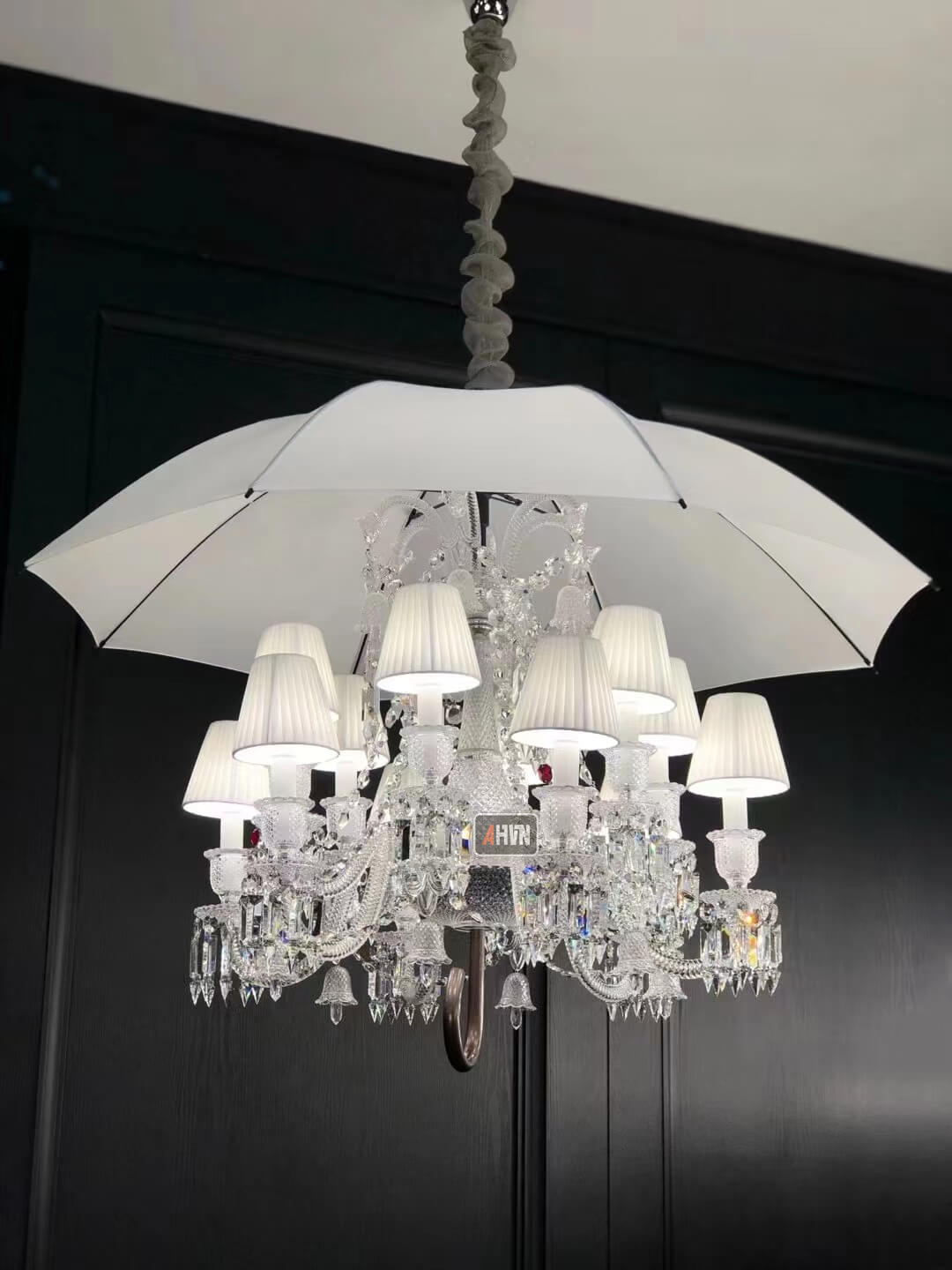 Chiếc đèn chùm này là một sáng tạo đầy cá tính, kết hợp giữa kỹ thuật chế tác thủ công truyền thống và một chi tiết trang trí đặc biệt: chiếc ô bao phủ phía trên – vừa mang tính biểu tượng, vừa tạo nên hiệu ứng ánh sáng mềm mại, khác biệt và đầy ấn tượng.