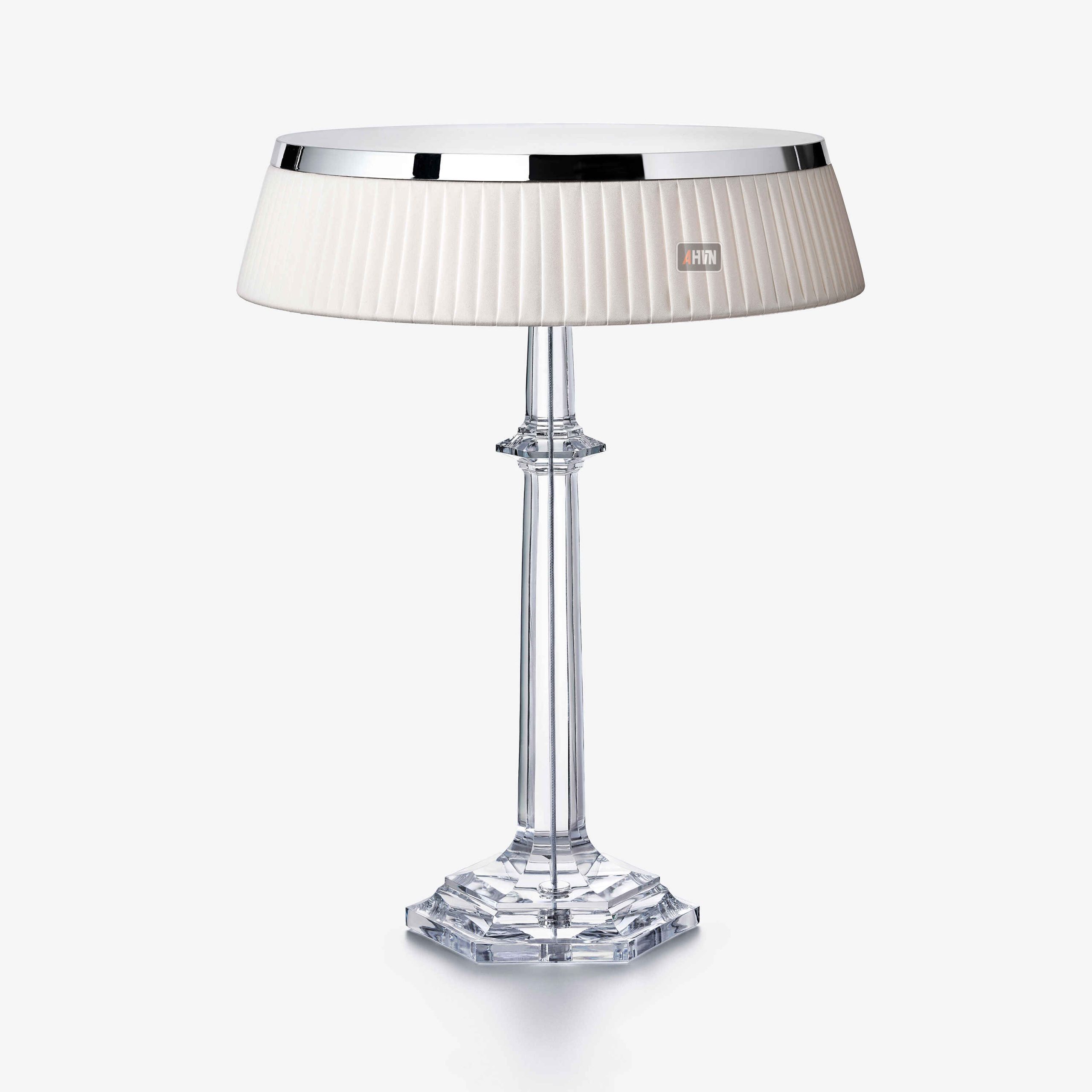 Chiếc đèn để bàn này mang vẻ đẹp của sự tối giản sang trọng, được chế tác hoàn toàn thủ công từ pha lê, inox và chao vải cao cấp. Thiết kế thân pha lê thẳng, trong suốt như cột ánh sáng, kết hợp với đế pha lê cắt giác tinh xảo giúp chiếc đèn vừa vững chắc vừa sang trọng theo phong cách kiến trúc hiện đại.