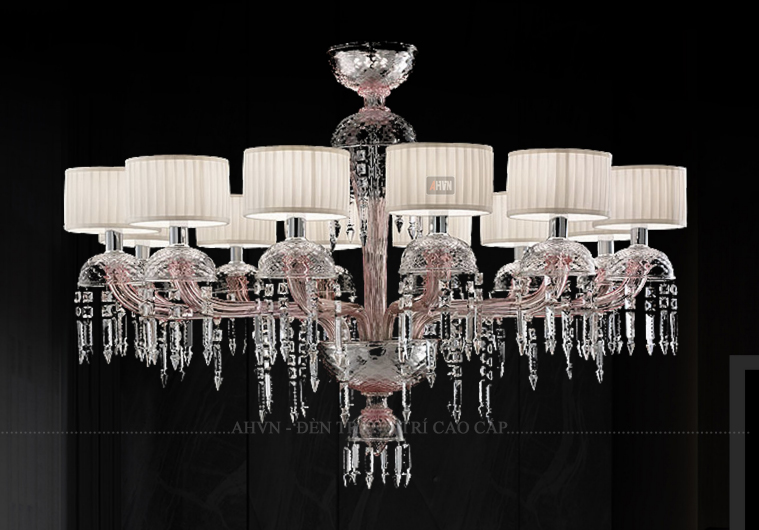 Những chao vải màu kem được may đo tỉ mỉ, giúp ánh sáng khi phát ra trở nên mềm mại, dịu dàng hơn. Sự kết hợp giữa pha lê và vải mang lại cảm giác ấm áp, thanh lịch và đầy chiều sâu thẩm mỹ, vừa sang trọng vừa gần gũi.