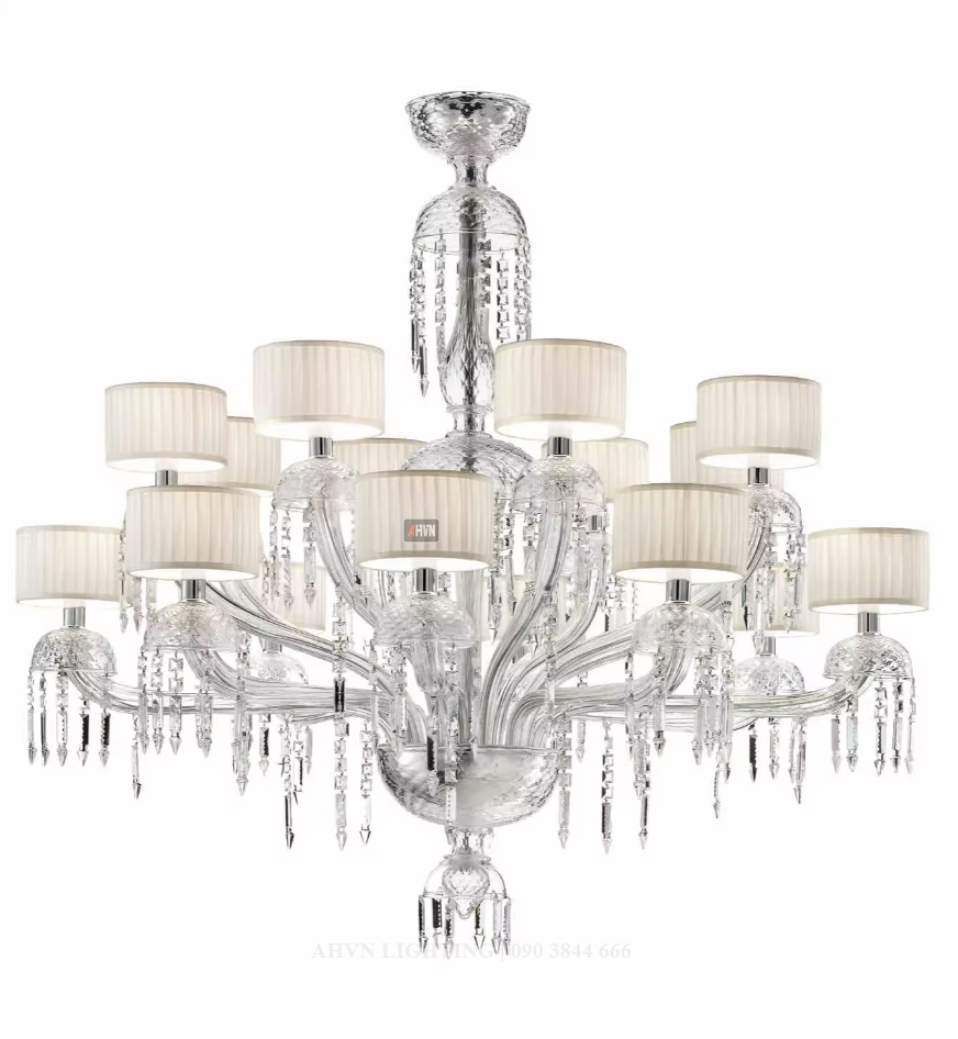 Những chao vải màu kem được may đo tỉ mỉ, giúp ánh sáng khi phát ra trở nên mềm mại, dịu dàng hơn. Sự kết hợp giữa pha lê và vải mang lại cảm giác ấm áp, thanh lịch và đầy chiều sâu thẩm mỹ, vừa sang trọng vừa gần gũi.