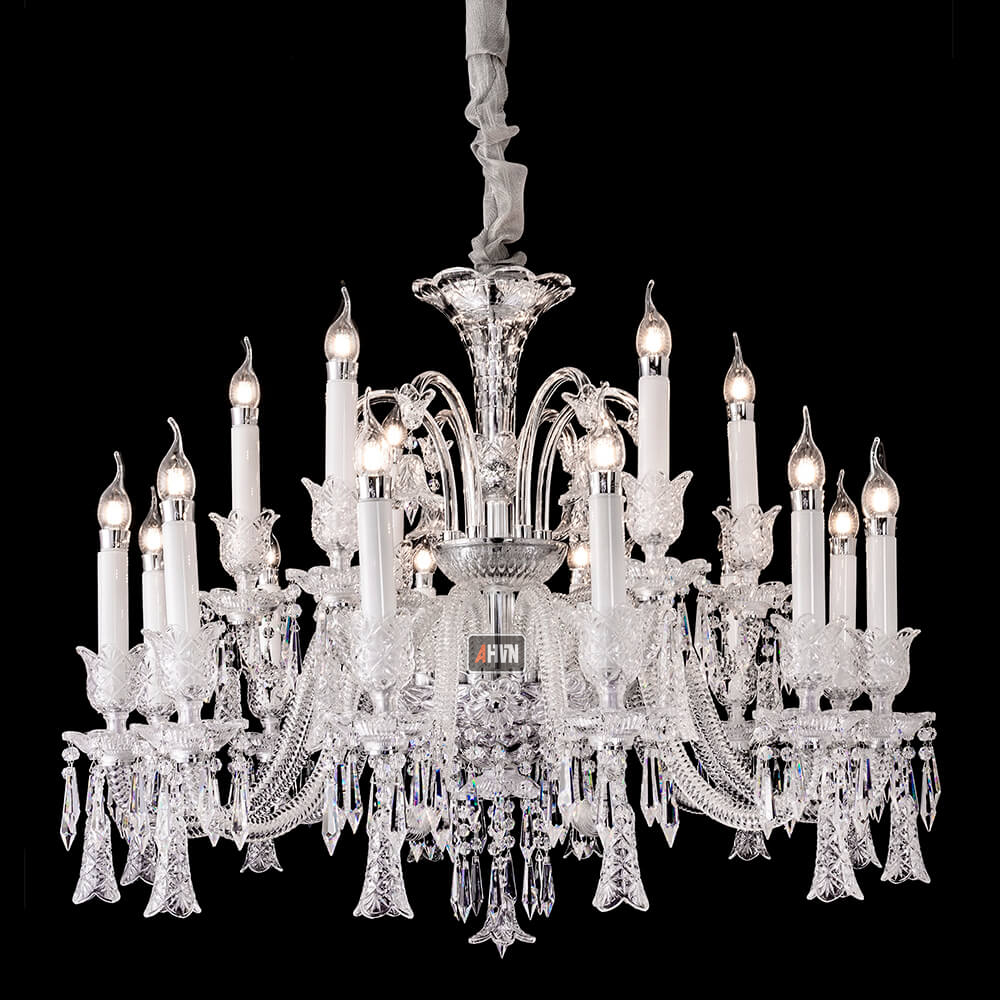 Kết cấu đèn nhiều tầng, hướng sáng theo dạng nến cổ điển, nhưng không cầu kỳ quá mức; thay vào đó, nó giữ tinh thần thanh lịch – sang trọng – chuẩn mực. Mỗi hạt pha lê đều được mài – đánh bóng – kiểm tra thủ công, tạo nên độ đồng đều mà chỉ những xưởng chế tác truyền thống mới có thể đạt được.