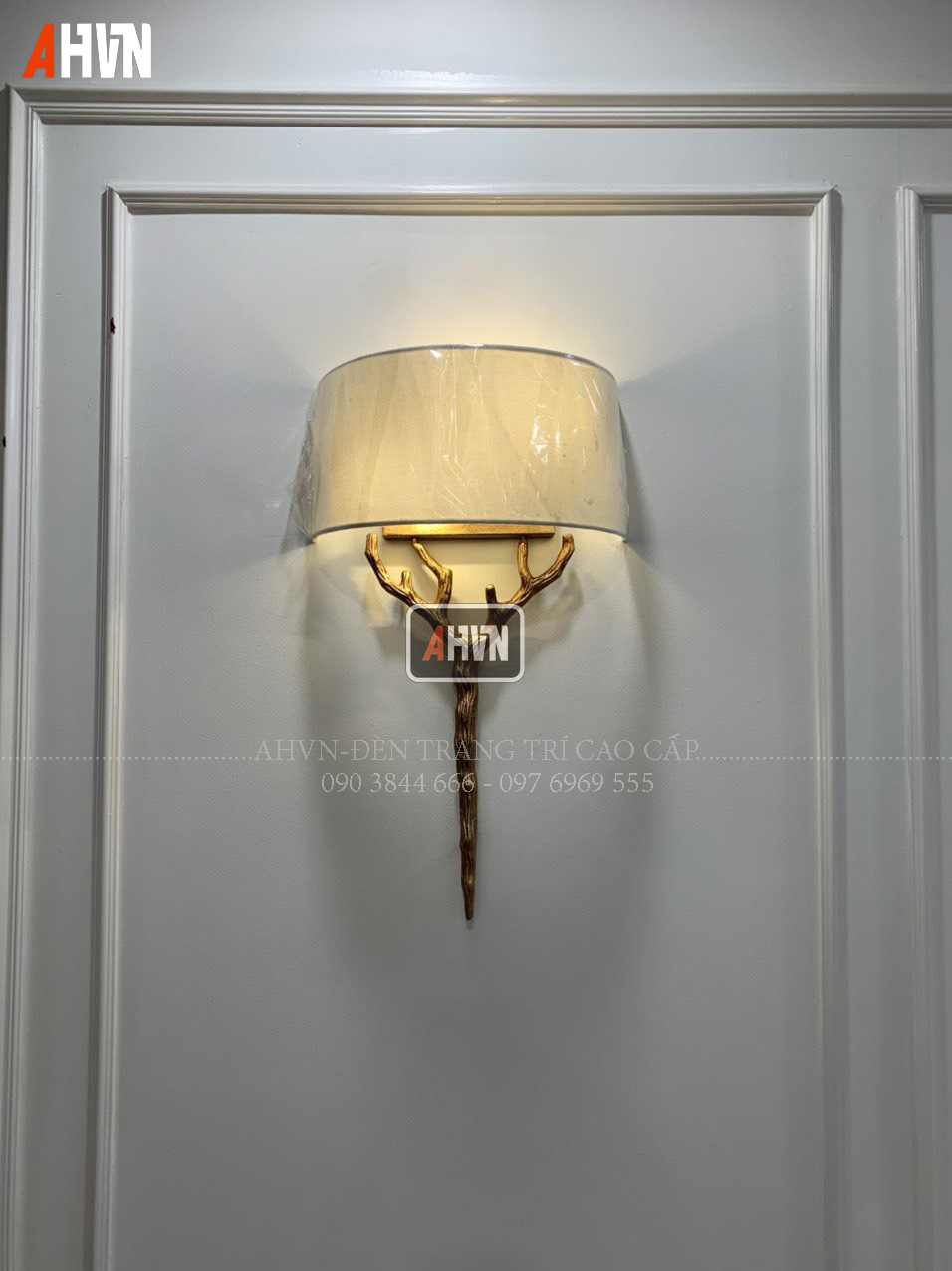 Chiếc đèn gắn tường AHVN này là sự giao thoa giữa chất liệu đồng thau chế tác thủ công và chao vải tinh tế, mang lại cảm giác vừa sang trọng vừa ấm áp cho không gian kiến trúc.