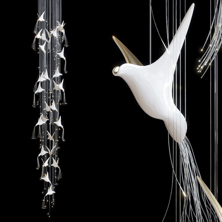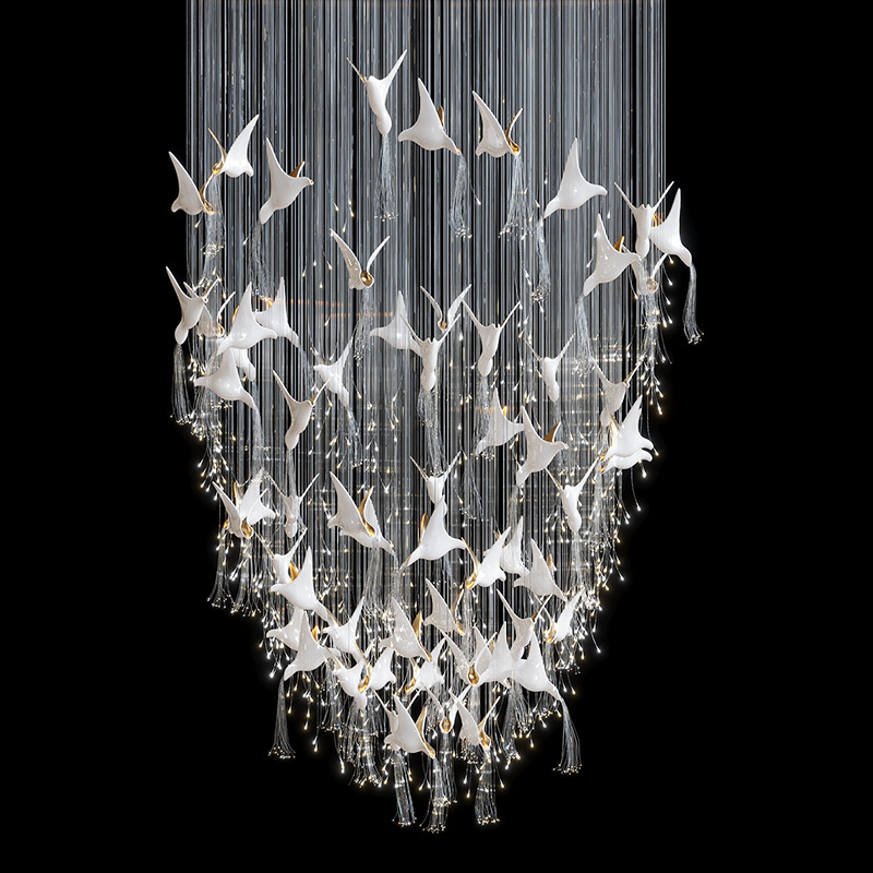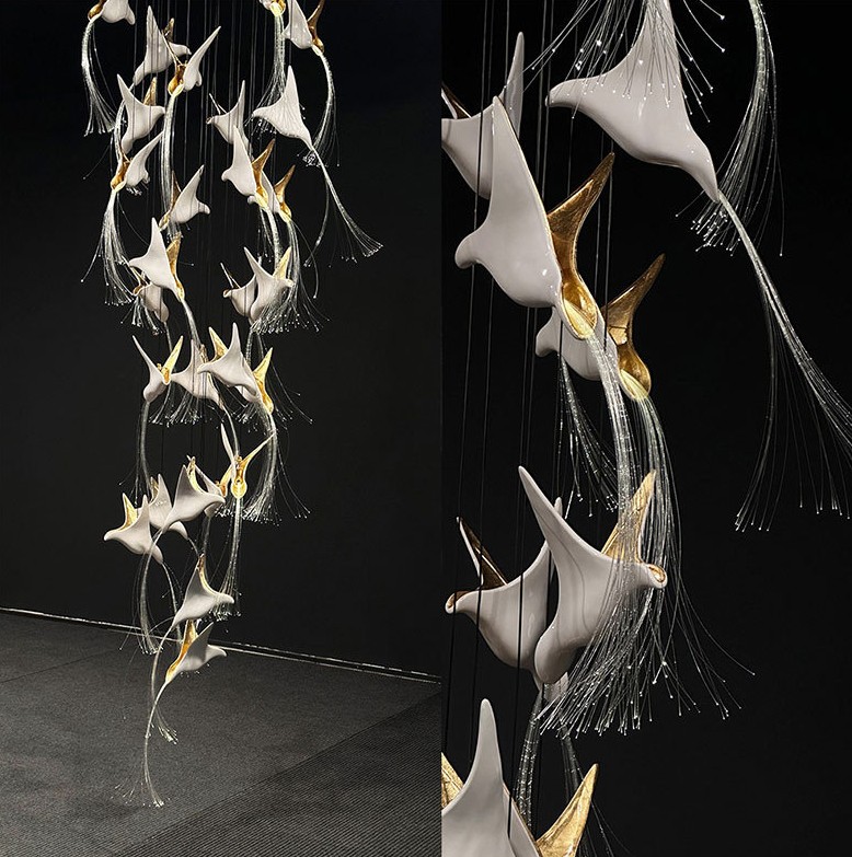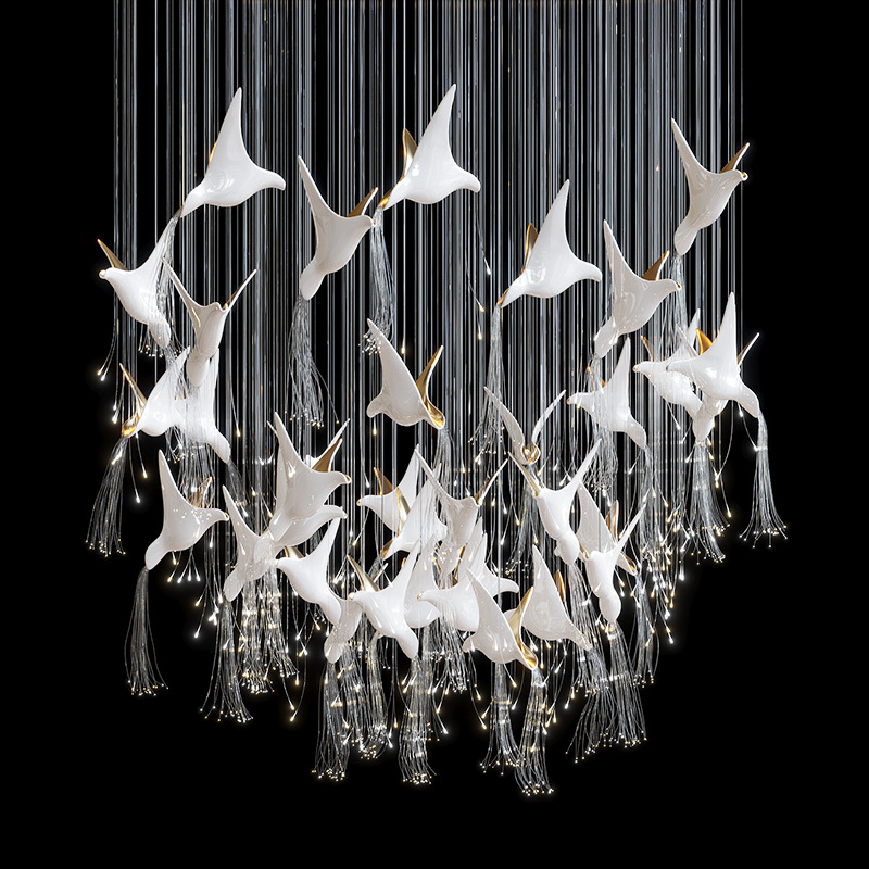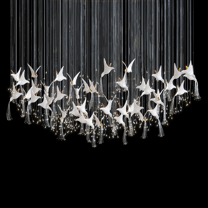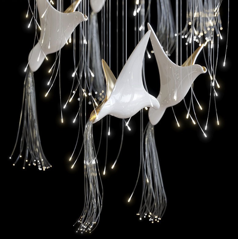 Chiếc đèn nghệ thuật này được chế tác từ gốm thủ công, kết hợp cùng hệ sợi quang tạo nên hiệu ứng ánh sáng mềm, lan toả như đàn chim đang bay giữa không trung. Phần mâm đèn bằng inox tráng gương giúp phản xạ ánh sáng tốt, giữ cho tổng thể luôn thanh thoát và sạch về đường nét.