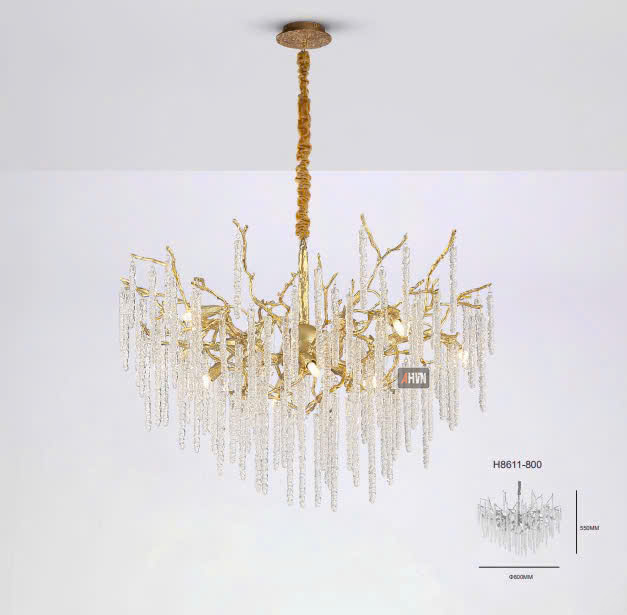 Chiếc đèn được chế tác thủ công từ đồng nguyên chất và pha lê cao cấp. Phần khung đồng được tạo hình bằng tay theo dạng các nhánh tự nhiên, xử lý bề mặt theo yêu cầu: vàng mờ, vàng cổ, đen đồng hoặc theo tông màu của từng công trình. Kết cấu này giúp đèn giữ được sự chắc chắn trong khi vẫn mang lại cảm giác nhẹ về thị giác.